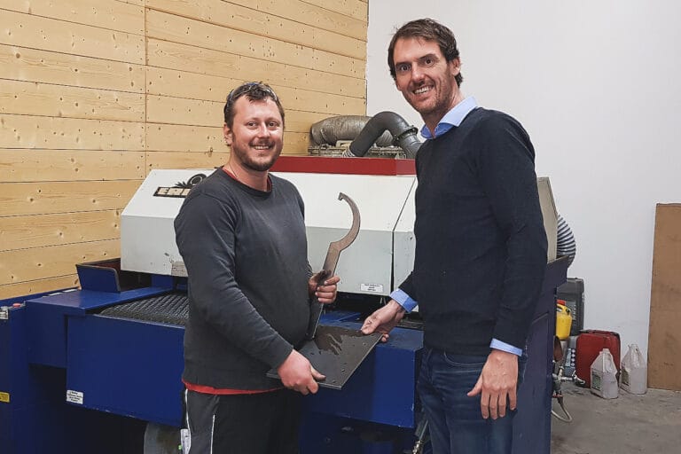 Boeck besucht echte Blechbearbeiter: Mailänder Industrietechnik Marc Böck und Fertigungsleiter Andria Lustig inspizieren einen Entgratteller HERO. Mit einer hohen Schleifmitteldichte