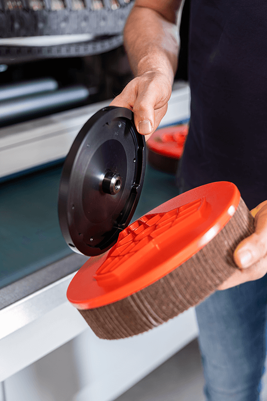 Im speziellen entschied sich die Firma Mailänder für die Entgratteller in der HERO-Variante. Diese ermöglicht extreme Verrundungen am Werkstück und außerdem hohe Vorschubgeschwindigkeiten. Sie besitzt eine hohe Schleifmitteldichte und Flexibilität. Verglichen mit den anderen zwei Ausführungen hat der HERO-Entgratteller weist er das höchste Zeitspanvolumen auf und erzeugt die stärksten Kantenverrundungen, sowohl an Außenkanten als auch an Bohrungen und Ausschnitten. Des Weiteren unterscheidet er sich zur STANDARD und PROFESSIONAL Ausführung in seiner Materialbeschaffenheit. Während die anderen beiden eine Kombination aus Schleifgewebe und Schleifvlies tragen, ist der HERO-Teller mit lasergeschnittenen Schleifgewebelamellen bestückt. Der Laser schneidet im Herstellungsprozess eine fingerartige Struktur hinein, was eine deutlich höhere Gewebedichte zulässt.