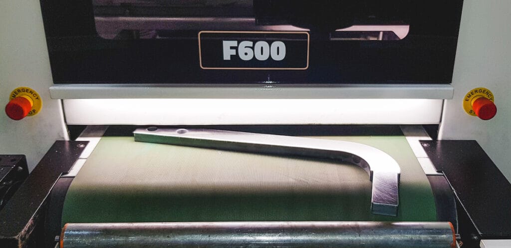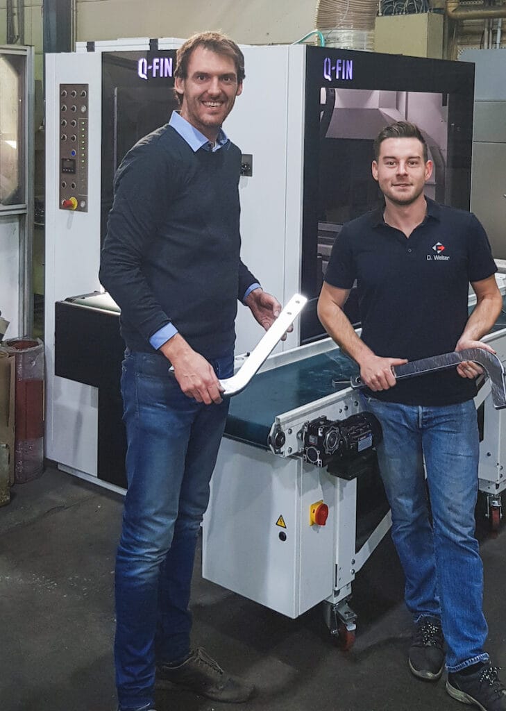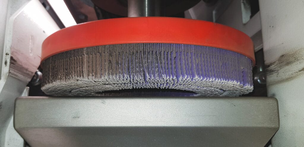 Dank der drei Bearbeitungsstationen – eine Schleifvorrichtung gefolgt von vier oszillierenden Bürsten – sind verschiedene Arbeitsschritte wie Entgraten und Kantenverrunden in einem Durchgang möglich – und das mit hoher Geschwindigkeit. „Wir wollten nicht einfach nur die manuelle Bearbeitung in einem maschinellen Prozess umwandeln, sondern unser Fokus lag vor allem auch darauf, eine sehr starke Kantenverrundung innerhalb kürzester Zeit bei gleichzeitig hoher Arbeitsgeschwindigkeit bzw. Vorschubgeschwindigkeit zu erzielen“, erklärt David Welter. „Die Q-FIN-Maschine ist perfekt für diese Anforderungen. Die passenden Werkzeuge, die in dieser Welt der Extreme Bestleistung bringen, fanden wir in den HERO-Entgrattellern von boeck.“