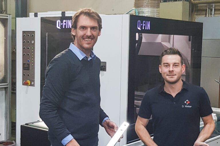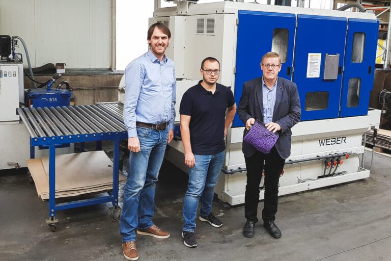 Schneller zu stärkerer Kantenverrundung Die Experten von der neuen WEBER-Entgratmaschine (v.l.): Ralf Eberhardt, Entwicklungsleiter bei der Eberhardt GmbH, Kevin Eberhardt,