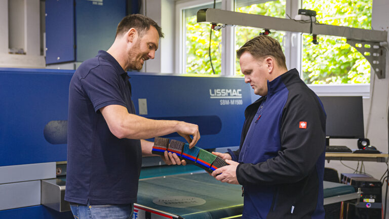 Boeck besucht echte Blechbearbeiter: Mailänder Industrietechnik Marc Böck und Fertigungsleiter Andria Lustig inspizieren einen Entgratteller HERO. Mit einer hohen Schleifmitteldichte